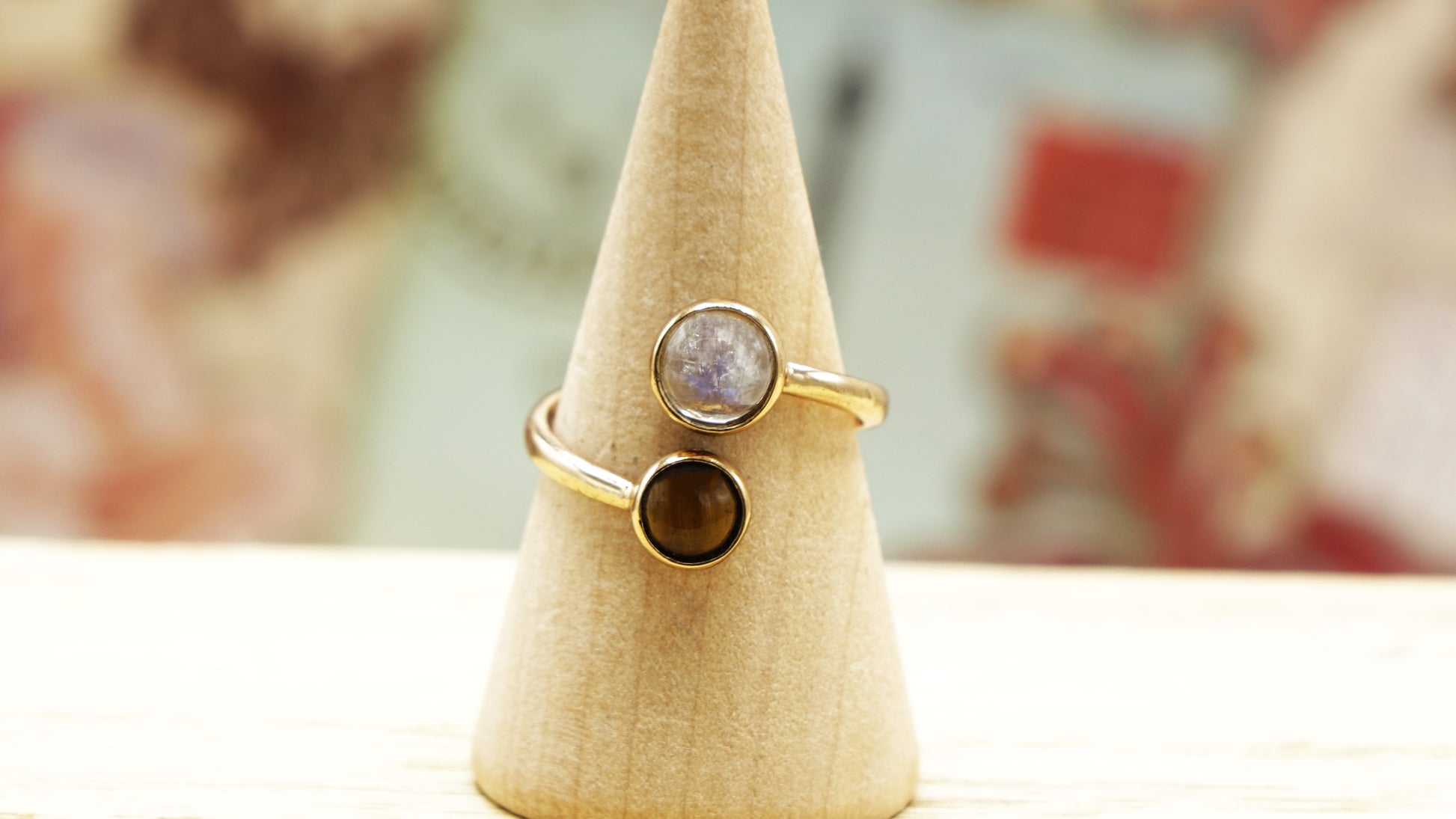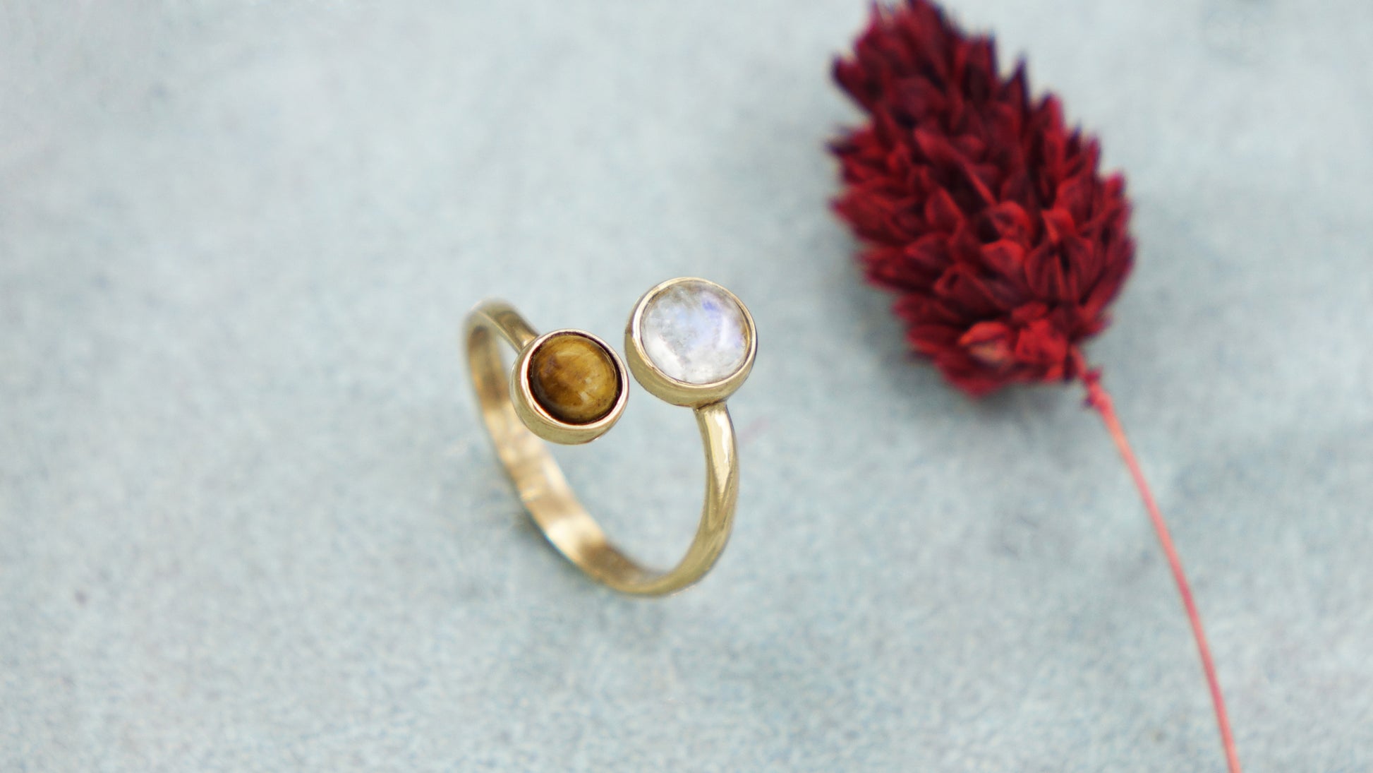 Unveil the celestial harmony of our Double Stone Ring, featuring the mesmerizing fusion of tiger's eye and moonstone. This ring captures the enchanting allure of two distinct gemstones in one captivating design.