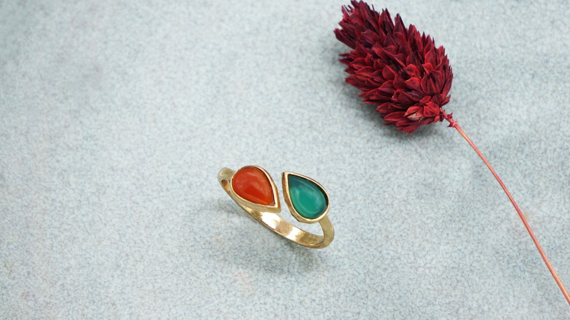 Red and Green Agate Gemstone Ring – a stunning fusion of earthy elegance and vibrant charm. Crafted with precision and care, this exquisite ring features a mesmerizing combination of rich red and lush green agate stones.